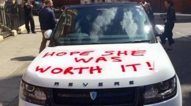Gari hilo jeupe aina ya Range Rover Revere lenye bei ya pauni 75,000 lilionekana limeegeshwa karibu na Harrods magharibi mwa London na kuchorwa ujumbe wa kukasirisha kwa kile kilichoonekana kuwa mpenzi aliyedanganywa.